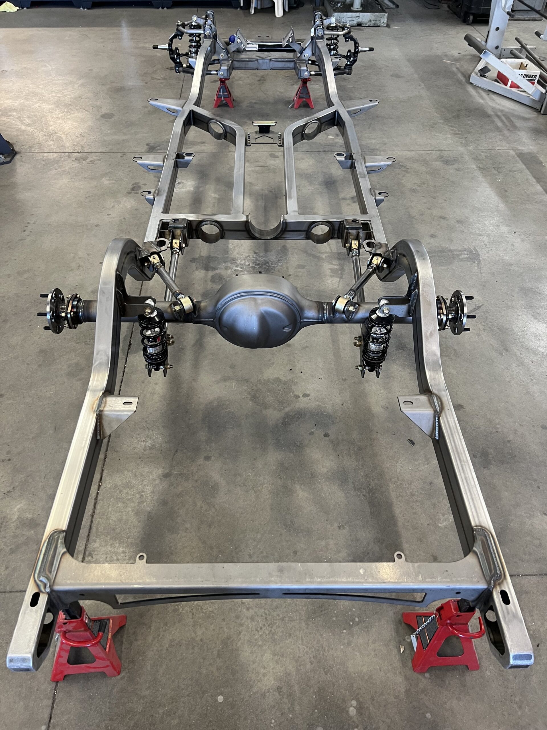 - Center frame construction w/adjustable transmission crossmember to accommodate a wide variety of most GM transmission and 4” exhaust ports